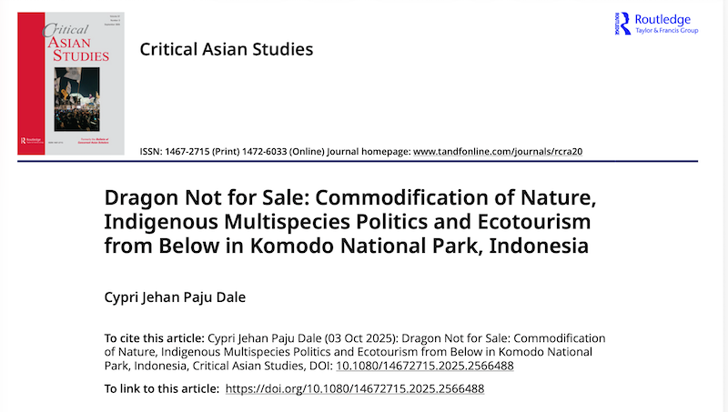 Judul Artikel: Dragon Not for Sale: Commodification of Nature, Indigenous Multispecies Politics and Ecotourism from Below in Komodo National Park, Indonesia; Penulis: Cypri Jehan Paju Dale; Penerbit: Critical Asian Studies; Tahun terbit: 2025
