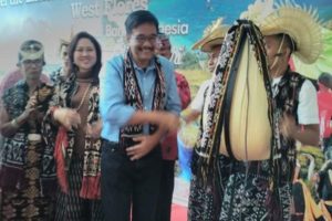 Djarot menyanyikan lagu ‘Tanah Air Beta’ didampingi istrinya. Ia juga sempat dikalungi salendang khas Rote, salah satu kabupaten di NTT tempat asal alat musik Sesando