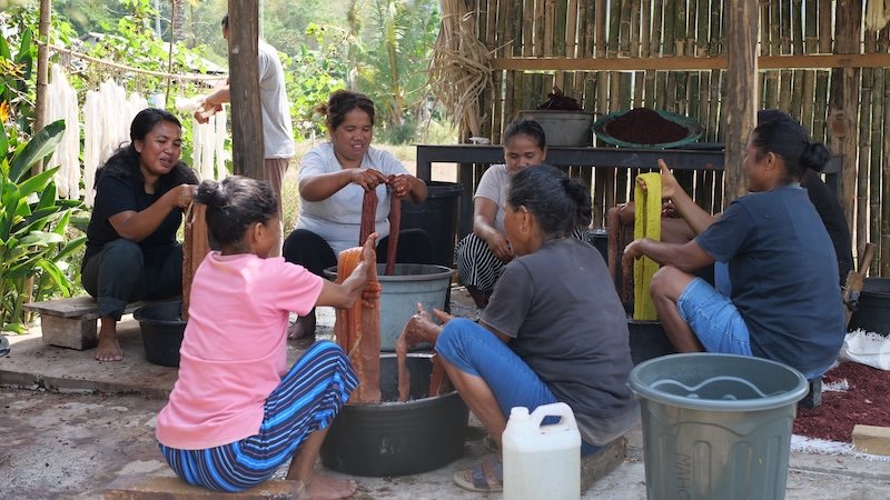 Selain menyaksikan secara langsung aktivitas Herlina dan Karolina, tur itu mencakup pengenalan proses pewarnaan alami yang berpusat di studio di tengah-tengah sawah bagian belakang rumah tenun.