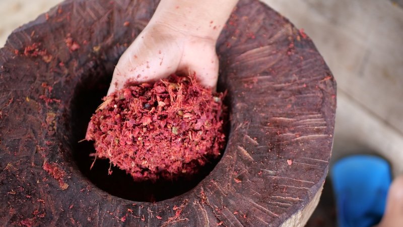 Kulit akar mengkudu yang baru saja ditumbuk, bahan baku untuk menghasilkan warna merah. (Foto: Thomas Bosko Jedoko)