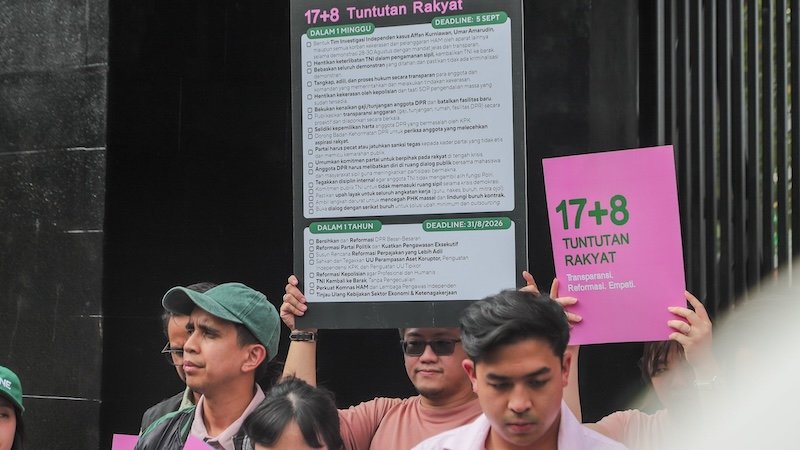 Sementara delapan tuntutan jangka panjang ditujukan untuk reformasi struktural: pembenahan DPR, transparansi partai politik, pengesahan RUU Perampasan Aset, reformasi kepolisian agar lebih humanis, hingga peninjauan ulang UU Cipta Kerja dan kebijakan ekonomi yang dianggap mengabaikan masyarakat adat serta lingkungan.