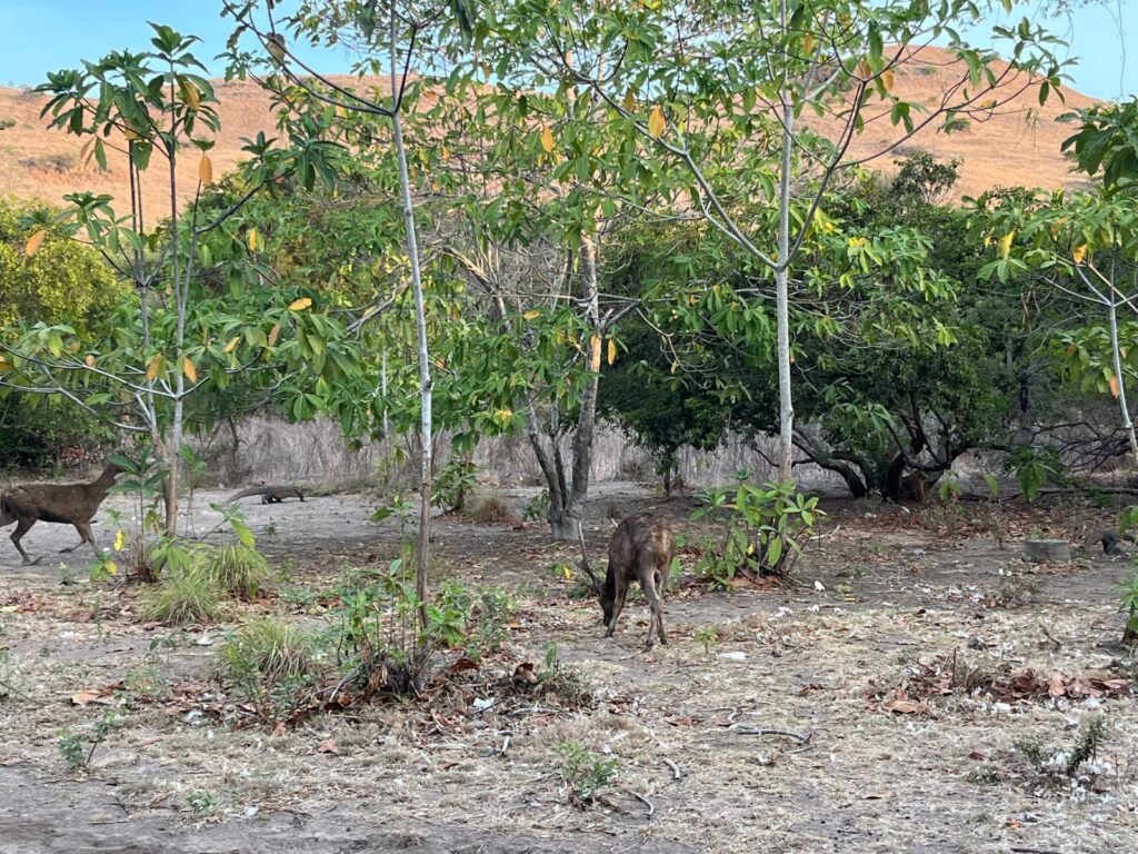 Sekitar 30 meter dari tempat pembuatan kamar mandi itu, pada 30 Agustus petang itu tiga ekor komodo dan dua ekor rusa sedang berlalu-lalang bermain.