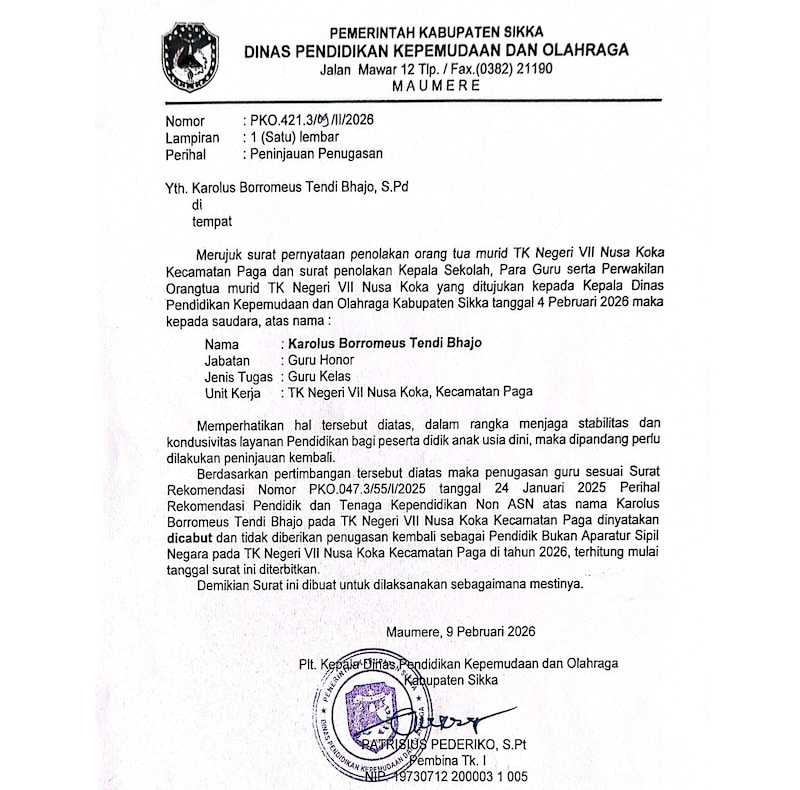 Dua bulan kemudian, posisinya diperkuat melalui Keputusan Kepala Dinas tentang “Penugasan Pendidik dan Tenaga Kependidikan Non-Aparatur Sipil Negara” di sekolah yang sama.