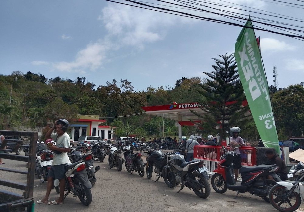 Antrean panjang di SPBU Wardun, Pasar Baru Labuan Bajo pada 19 Agustus 2025. (Dokumentasi Floresa)