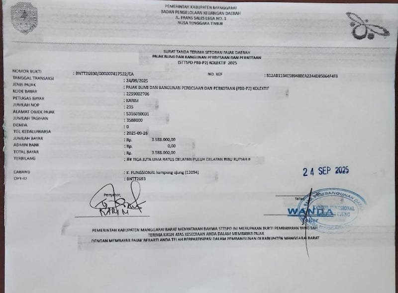 Dalam sebuah kuitansi yang diperoleh Floresa, Desa Komodo telah membayar PBB Kolektif 2025 senilai Rp3.588.000 pada 24 September. Nilai itu merupakan total tagihan terhadap 235 NOP.
