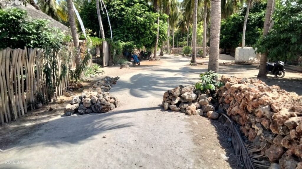 Ruas jalan publik menuju NIHI Rote, hotel mewah yang memprivatisasi Pantai Bo’a di pesisir barat Pulau Rote, NTT. Warga memblokir jalan itu dengan tumpukan batu pada 27 Oktober 2025. (Dokumentasi warga)