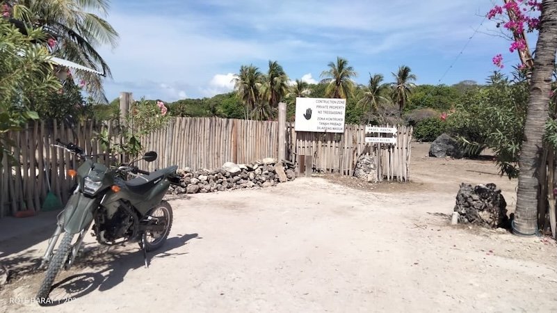 Sebuah sepeda motor milik TNI terparkir di ruas jalan lapen menuju NIHI Rote, hotel mewah yang memprivatisasi Pantai Bo’a di pesisir barat Pulau Rote, NTT. Warga memblokir jalan itu dengan campuran semen pada 10 Oktober 2025. (Dokumentasi warga)