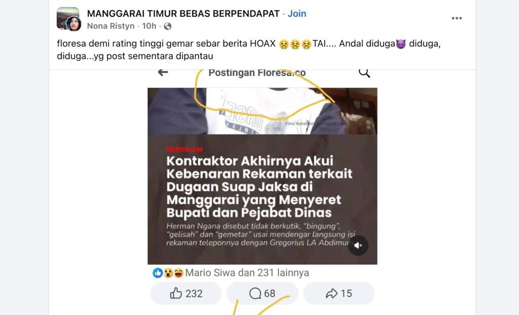 Floresa.co – Salah satu akun Facebook gerilya menyebarkan tudingan bahwa berita Floresa soal dugaan suap para jaksa yang menyeret bupati dan para pejabat dinas adalah hoaks.