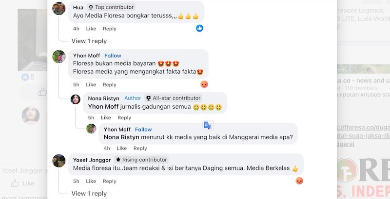Pengguna Facebook lainnya menulis bahwa Floresa “menunjukkan keberanian dan integritas sebagai media yang independen.”