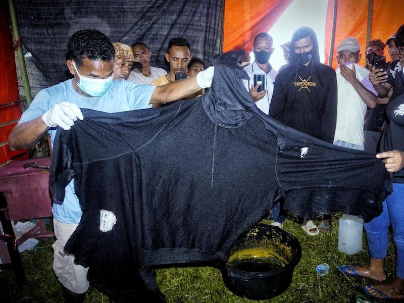 Kampianus Raru memperlihatkan kepada wartawan sweater hitam milik Restina Tija yang robek. (Dokumentasi Floresa)