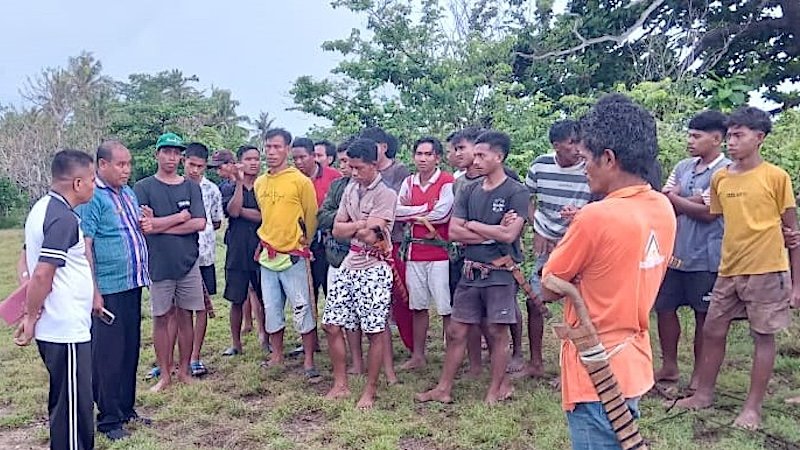 Warga bertemu Camat Lamboya, Yosep Matti Pati (berbaju hijau) dan Kapolsek Lamboya, Horacio Correia Gama Do Rego (berbaju putih) di pesisir Marosi, Kabupaten Sumba Barat pada 8 November 2025. (Dokumentasi warga)