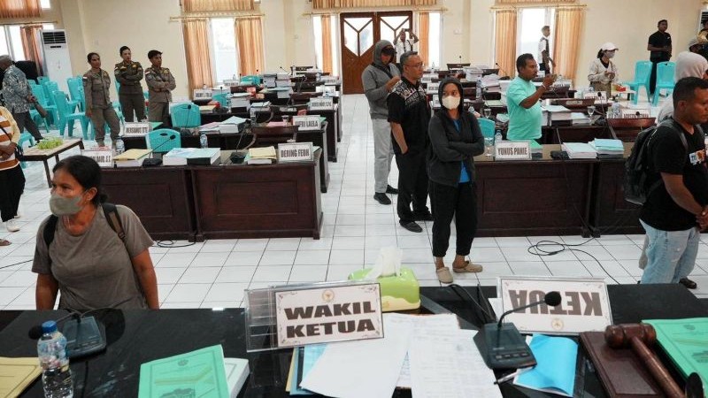 Dalam video yang diterima Floresa pada 18 April, tampak lebih dari 20 polisi laki-laki mendorong mundur warga sebelum Apremoi dan beberapa anggota dewan keluar dari ruangan tertutup.