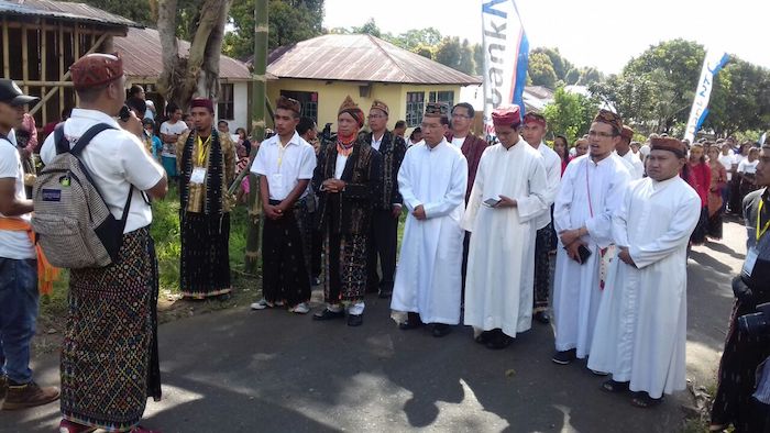 Selanjutnya, rombongan disambut di depan gerbang SMP-SMA St. Claus dengan kepok – ritus adat Manggarai untuk menerima tamu – yang dibawakan oleh tetua adat dari Paroki St. Claus.